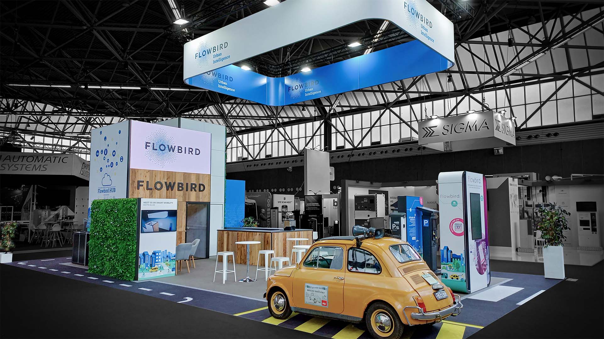 Le stand Flowbird offre une immersion au cœur de la mobilité urbaine de demain. Son design moderne, mis en valeur par la Fiat 500’R’74 emblématique de 1974, attire le regard et invite les visiteurs à découvrir les solutions innovantes de la marque. Un espace particulièrement sur mesure, accueillant, lumineux et pensé pour favoriser l’échange.