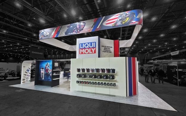 Pour LIQUI MOLY au salon du 2 roues, nous avons conçu un stand sur mesure pensé comme une vitrine immersive de la marque. Une grande enseigne suspendue structure l’espace et assure une forte visibilité dans le hall, tandis que plusieurs motos exposées et mises en valeur incarnent l’univers de performance et de passion mécanique.