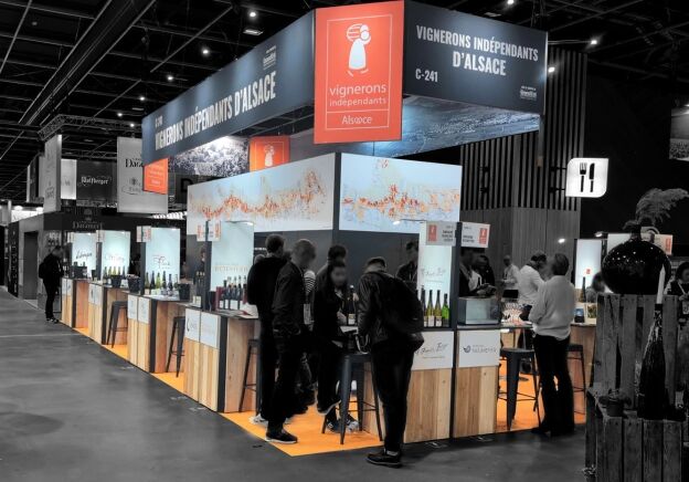 Ce stand modulaire privilégie la clarté et l’échange, mettant en avant chaque domaine grâce à des comptoirs de dégustation individuels parfaitement intégrés. Sous d’imposantes enseignes suspendues, la scénographie graphique valorise l’identité collective des Vignerons Indépendants tout en affirmant une exigence contemporaine.